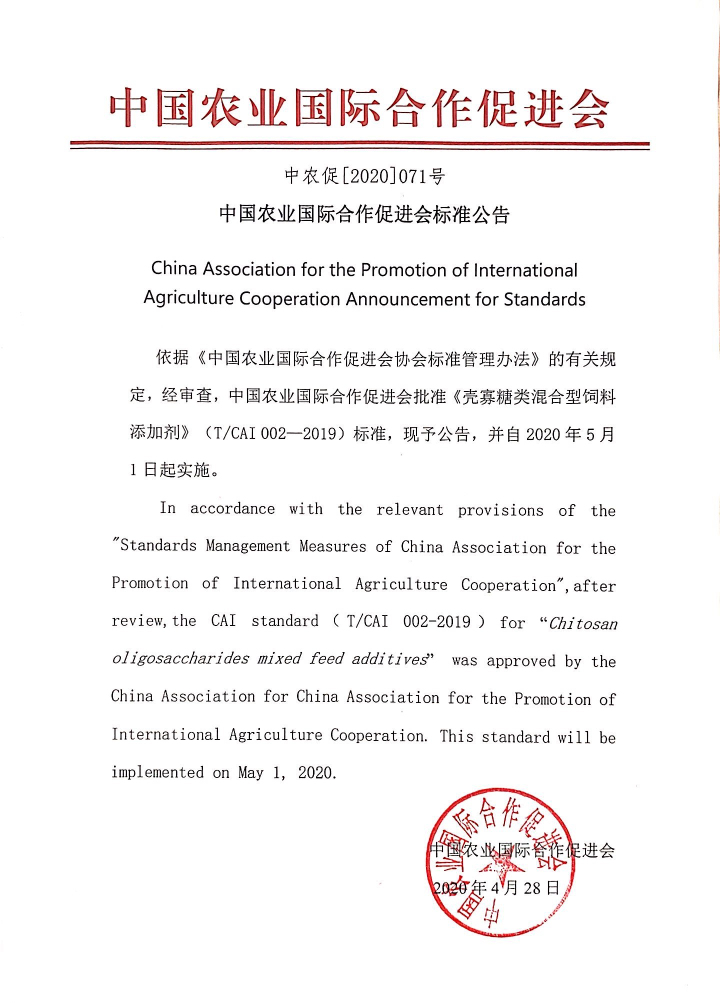 經(jīng)過將近一年的準備和各位專家的認真審閱與修改,由中國農(nóng)業(yè)合作促進會發(fā)起,山東衛(wèi)康生物醫(yī)藥科技有限公司聯(lián)合殼寡糖行業(yè)的多家企業(yè)及中國科學(xué)院海洋研究所、中國海洋大學(xué)醫(yī)藥學(xué)院、中國科學(xué)院煙臺海岸帶研究所、哈爾濱工業(yè)大學(xué)、青島農(nóng)業(yè)大學(xué)等科研院校共同制定的《殼寡糖類混合型飼料添加劑》(T/CAI 002-2019)標準于2020年5月1日起正式開始實施。